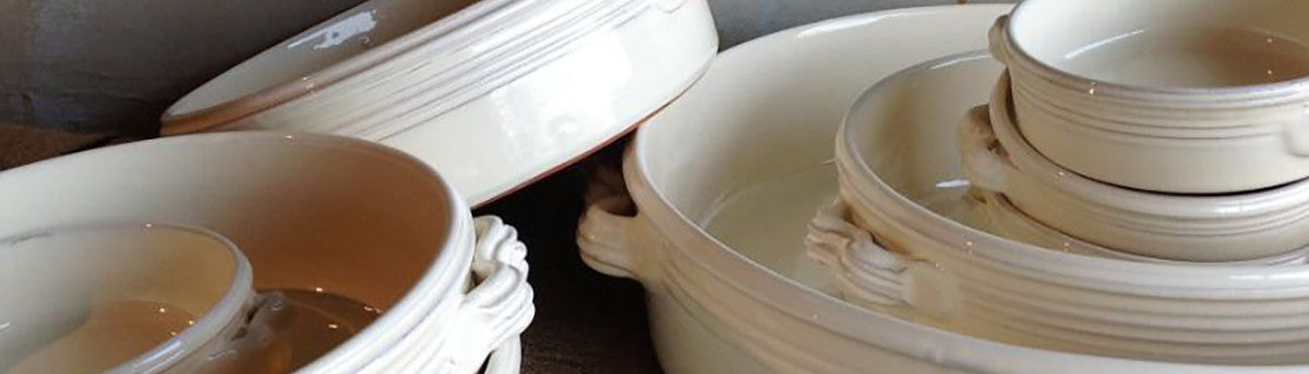 Our Bakeware is handmade using the red clay found in Italy's traditional bakeware. The round soft cream colored bakeware adds character and will make a lovely presentation for serving a great meal. The glaze over the porous terra cotta develops a lovely light crackle with use, which gives the piece a beautiful look.